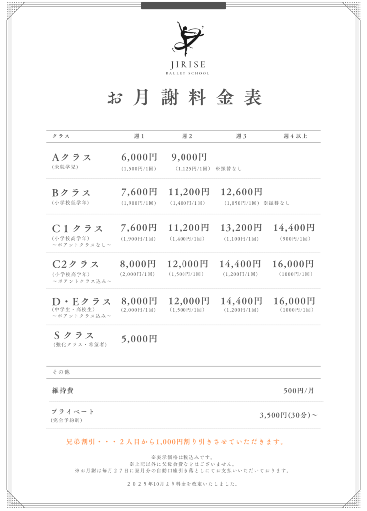 ジュニアクラス 料金表