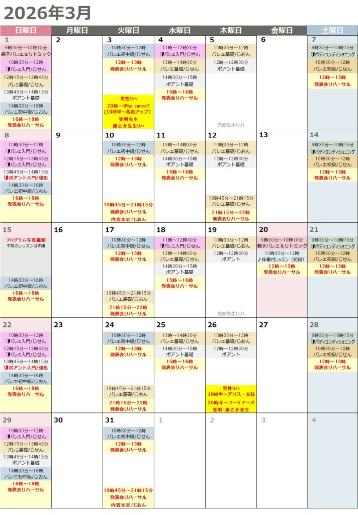 1月から来年7月22日開催の発表会に向けて出演する方のリハーサルが始まるため少し変更点がございます。